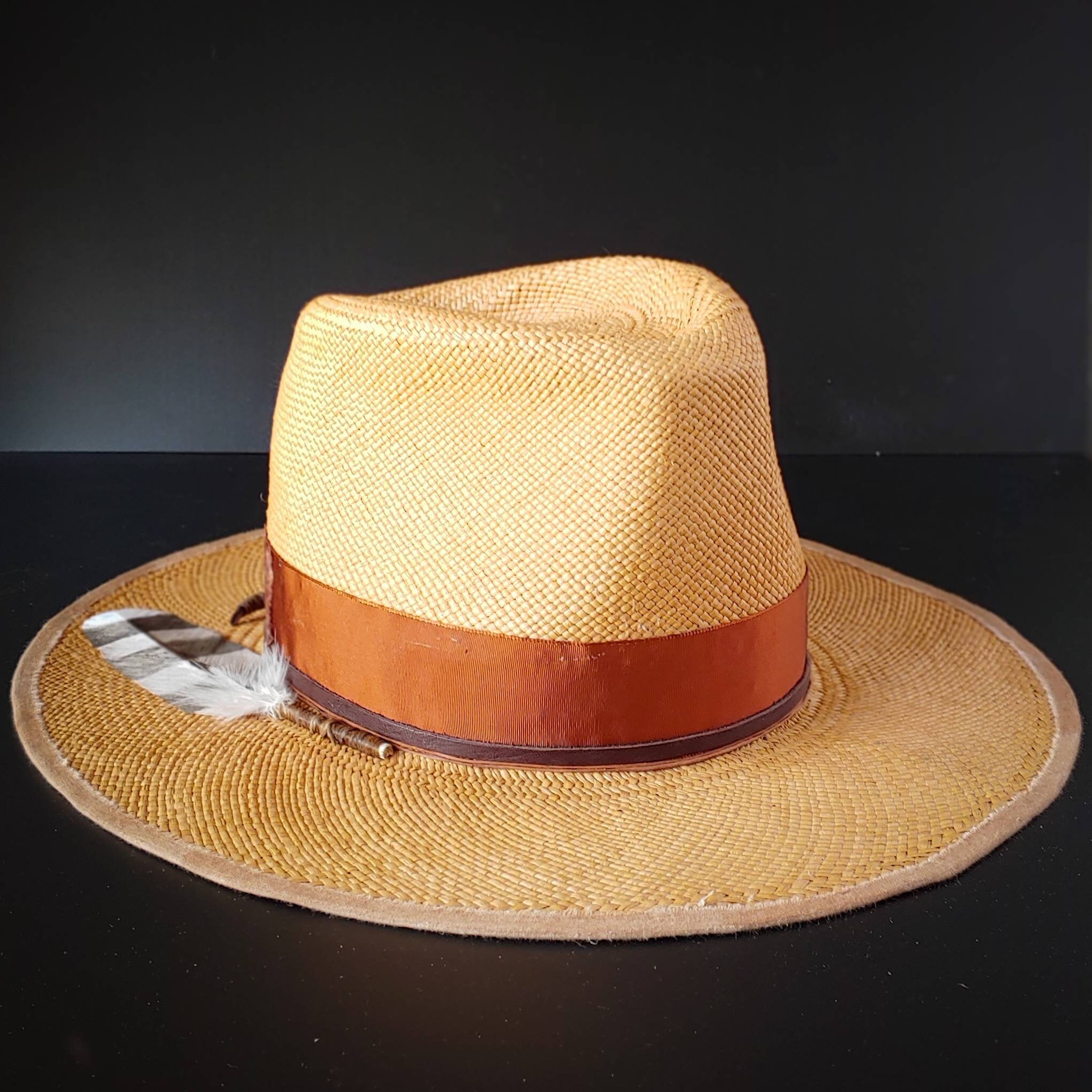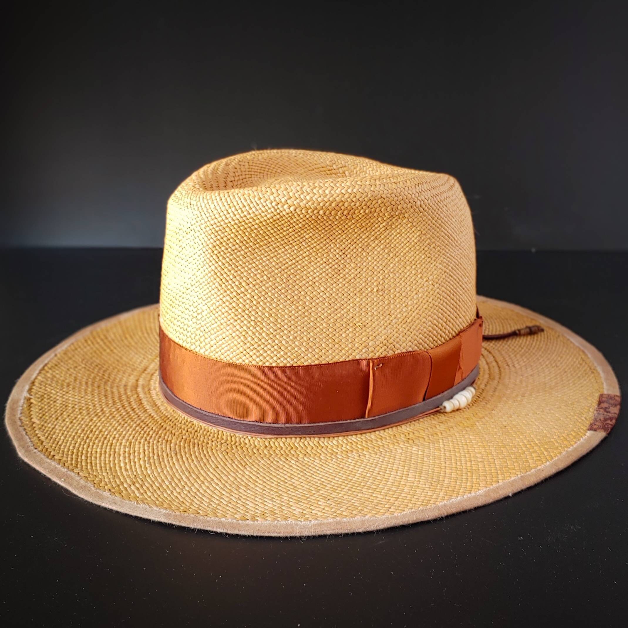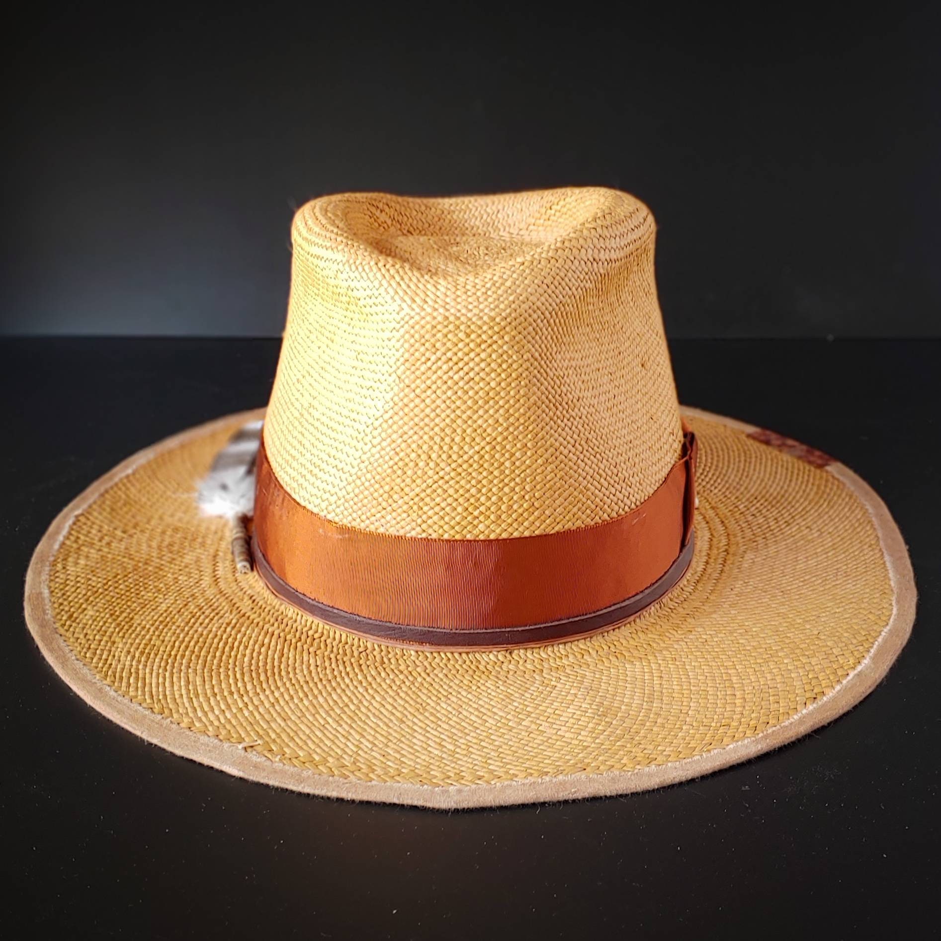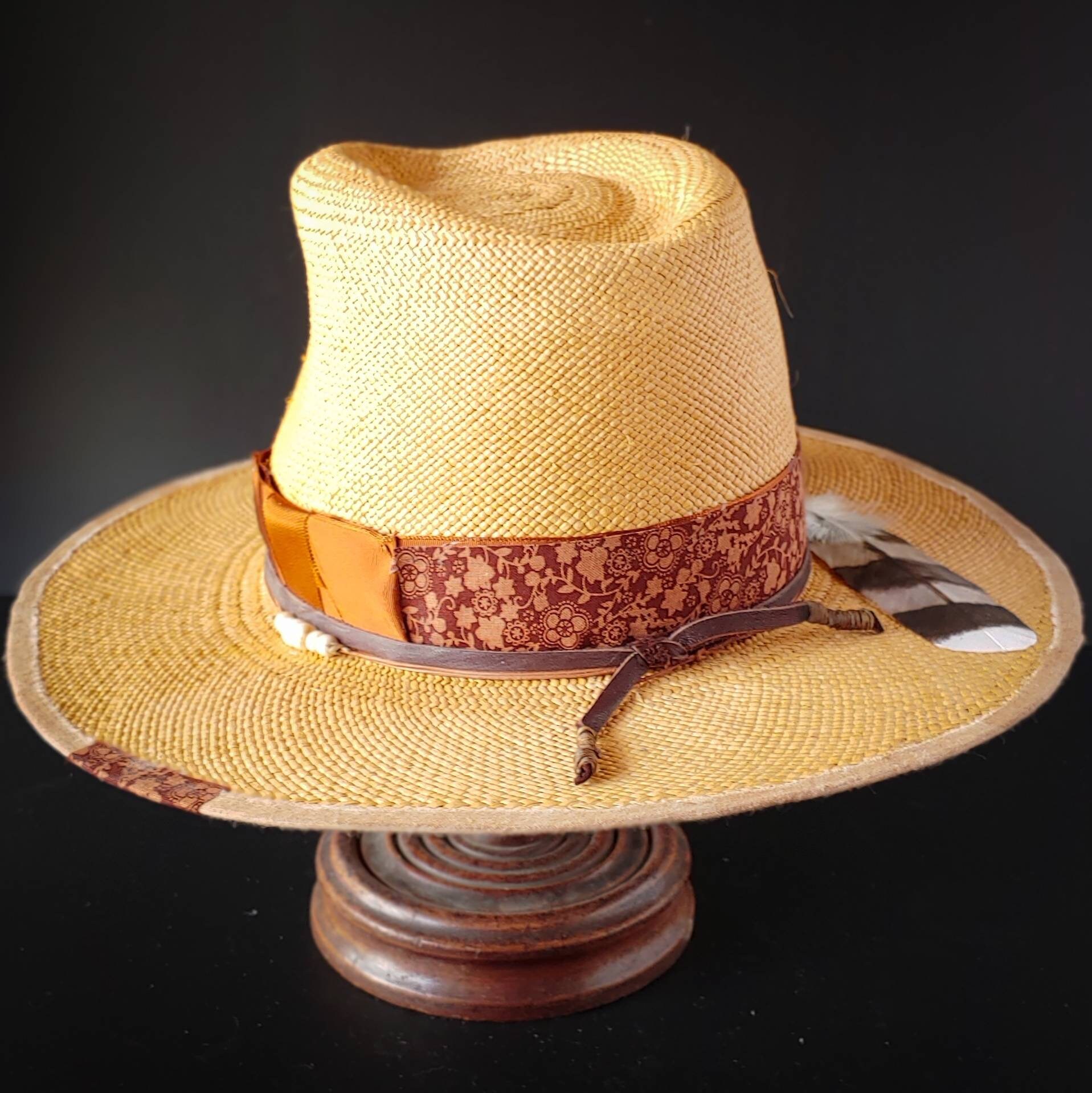 The "Hell's Canyon Survivor" is a size 7, golden corn color straw hat. Handmade by Ugly Outlaw. The crown is around 4 1/2 inches high with a 3 1/4 inches wide brim. A vintage copper color gross grass ribbon wraps around with a handmade bow to adorn the side. A piece of vintage patterned fabric is on part of the backside of the ribbon for extra decor. The same fabric can be seen wrapped around the edge of a section of the brim as well.