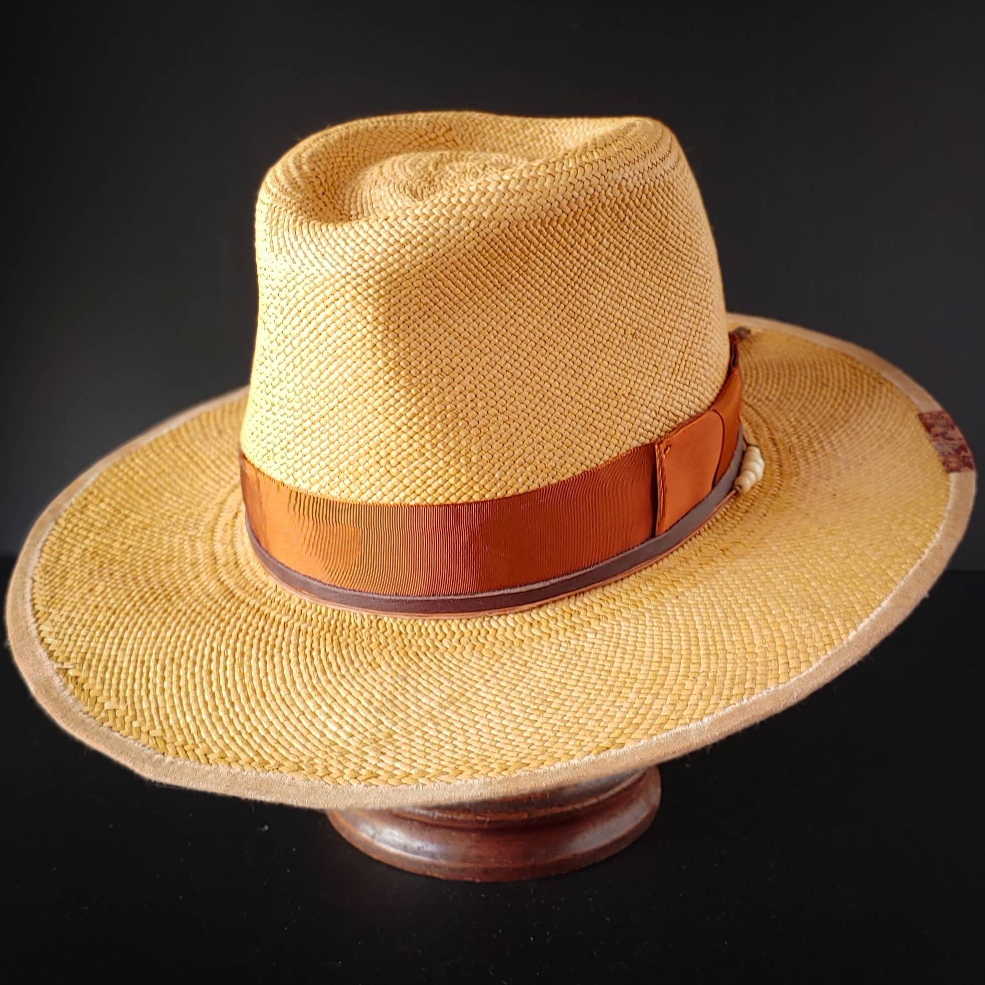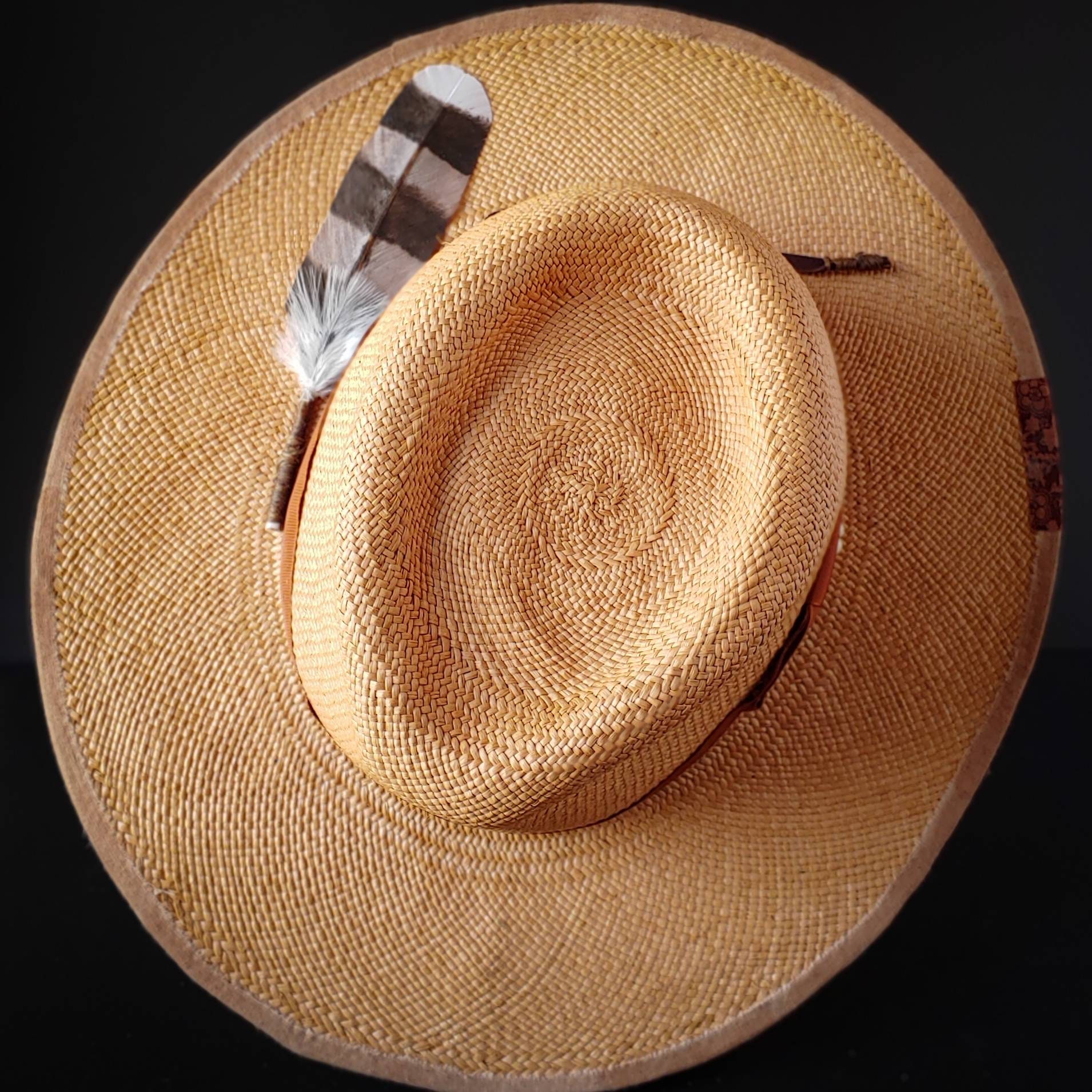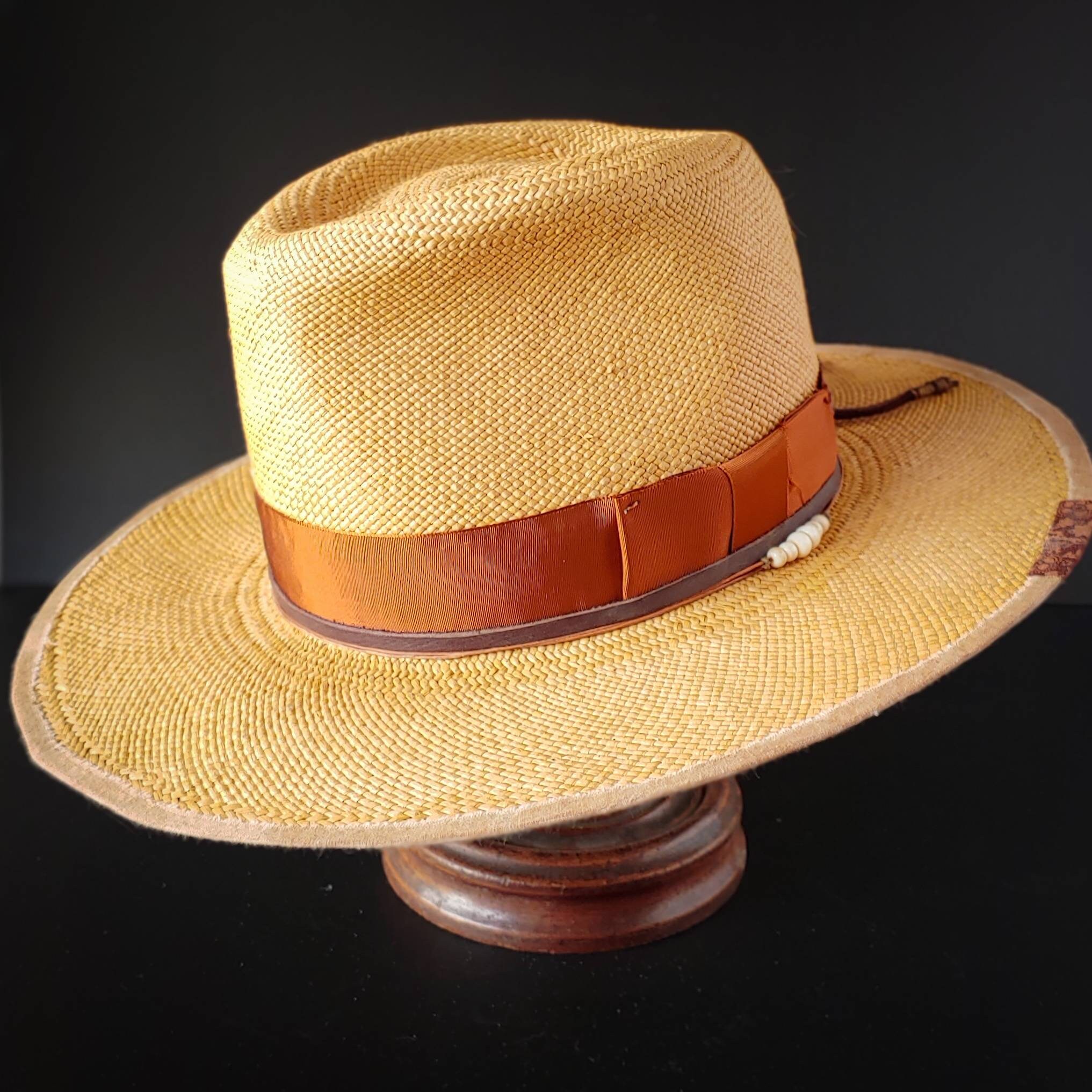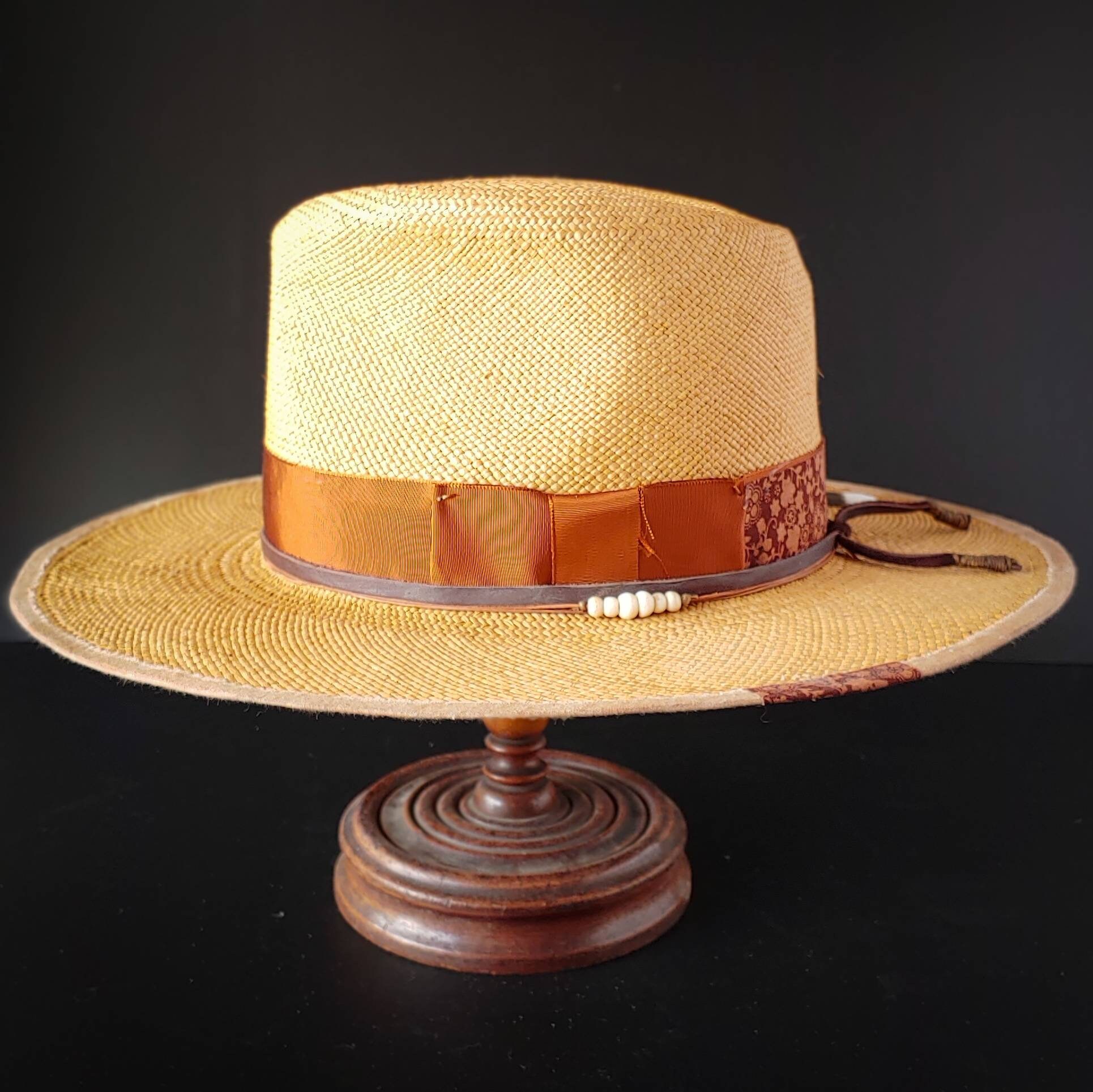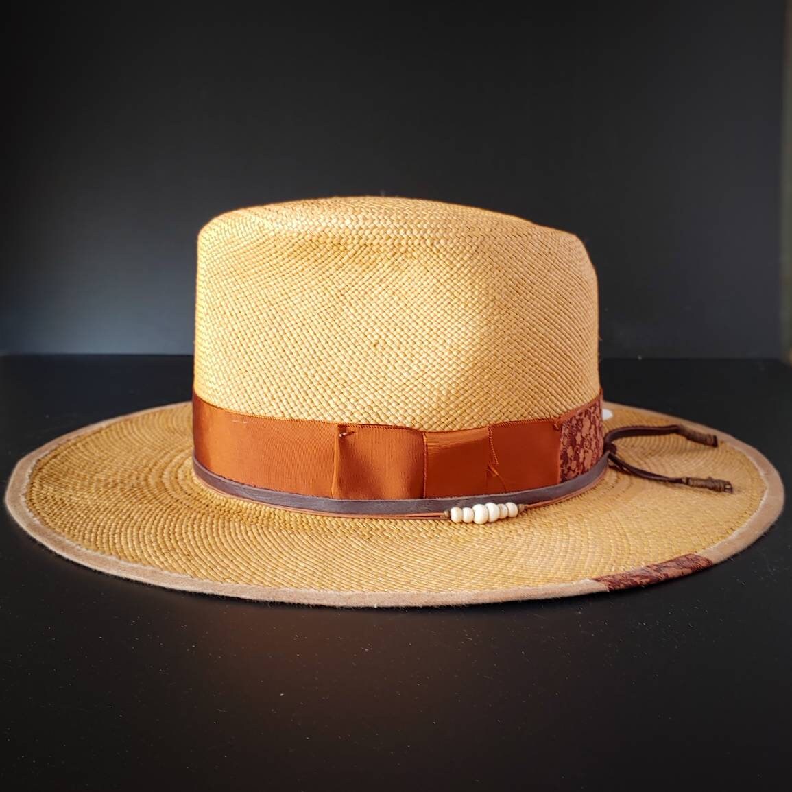 The "Hell's Canyon Survivor" is a size 7, golden corn color straw hat. Handmade by Ugly Outlaw. The crown is around 4 1/2 inches high with a 3 1/4 inches wide brim. A vintage copper color gross grass ribbon wraps around with a handmade bow to adorn the side. A piece of vintage patterned fabric is on part of the backside of the ribbon for extra decor. The same fabric can be seen wrapped around the edge of a section of the brim as well.