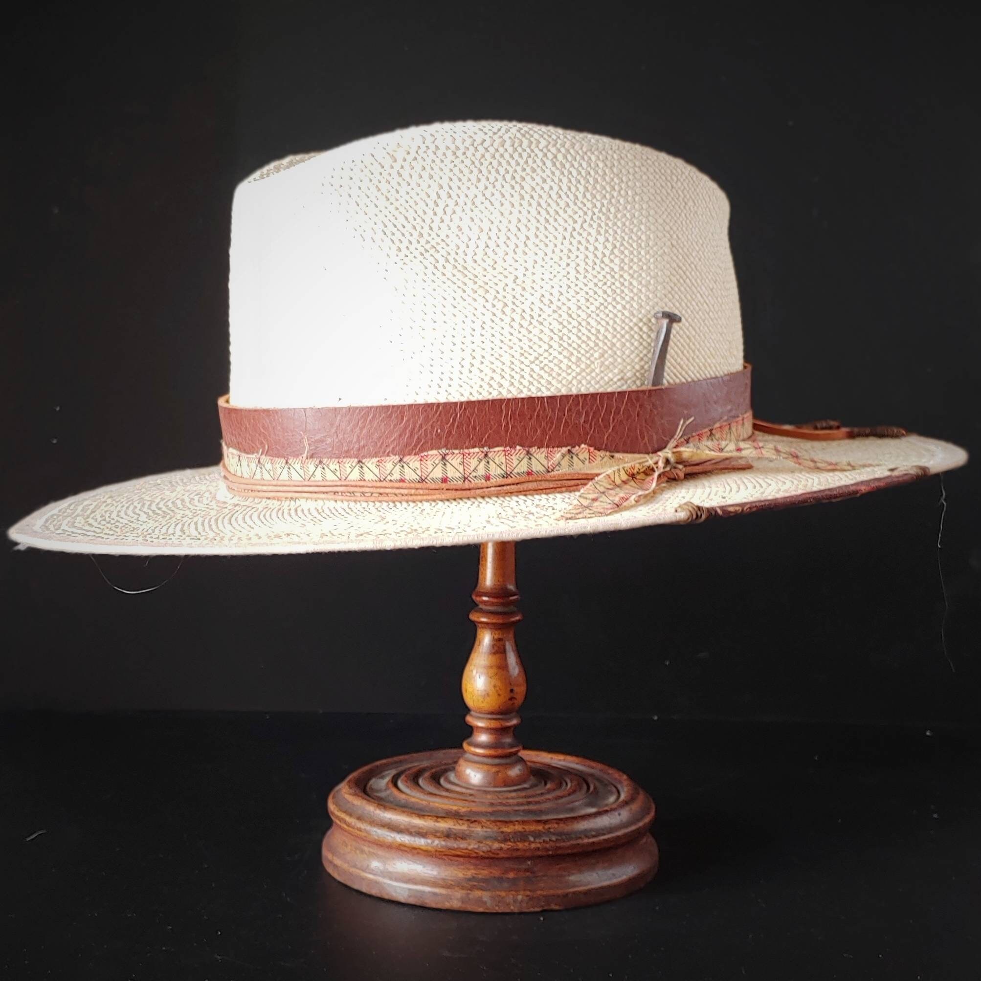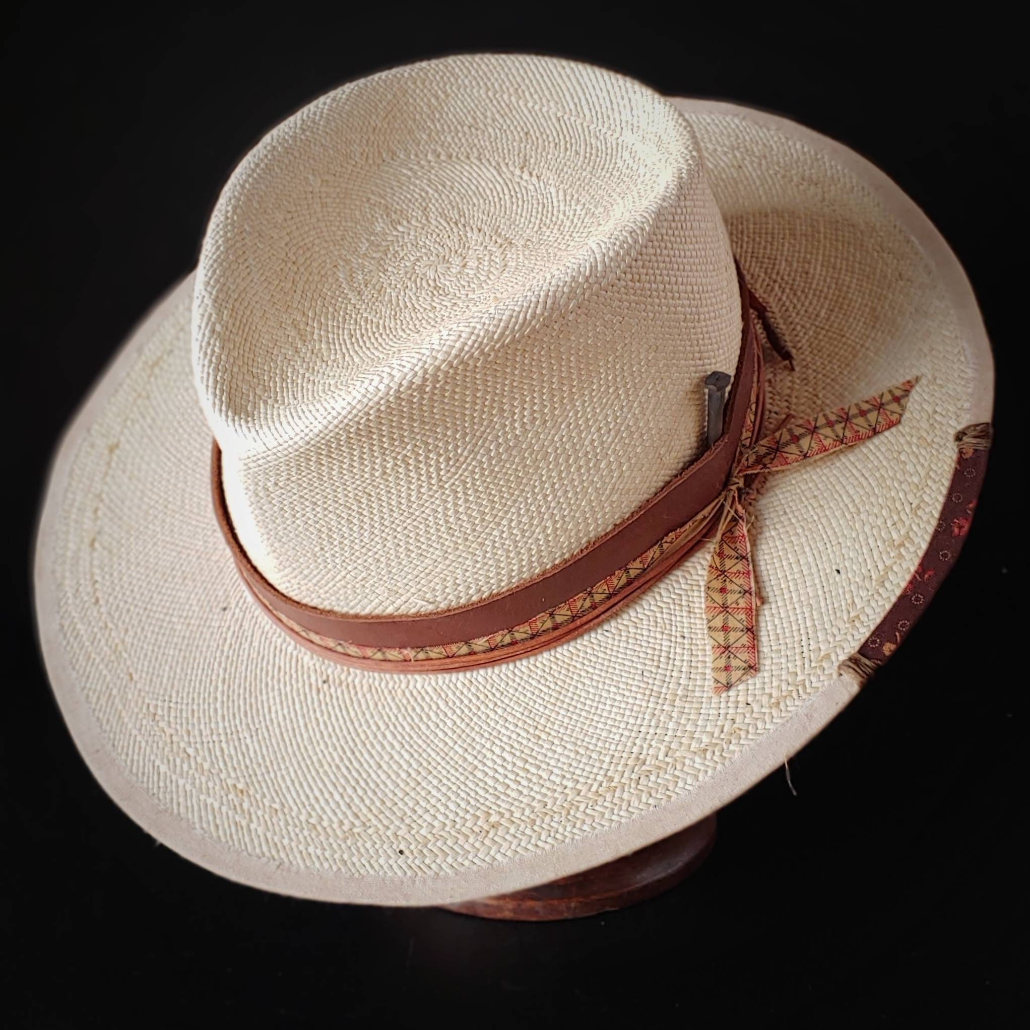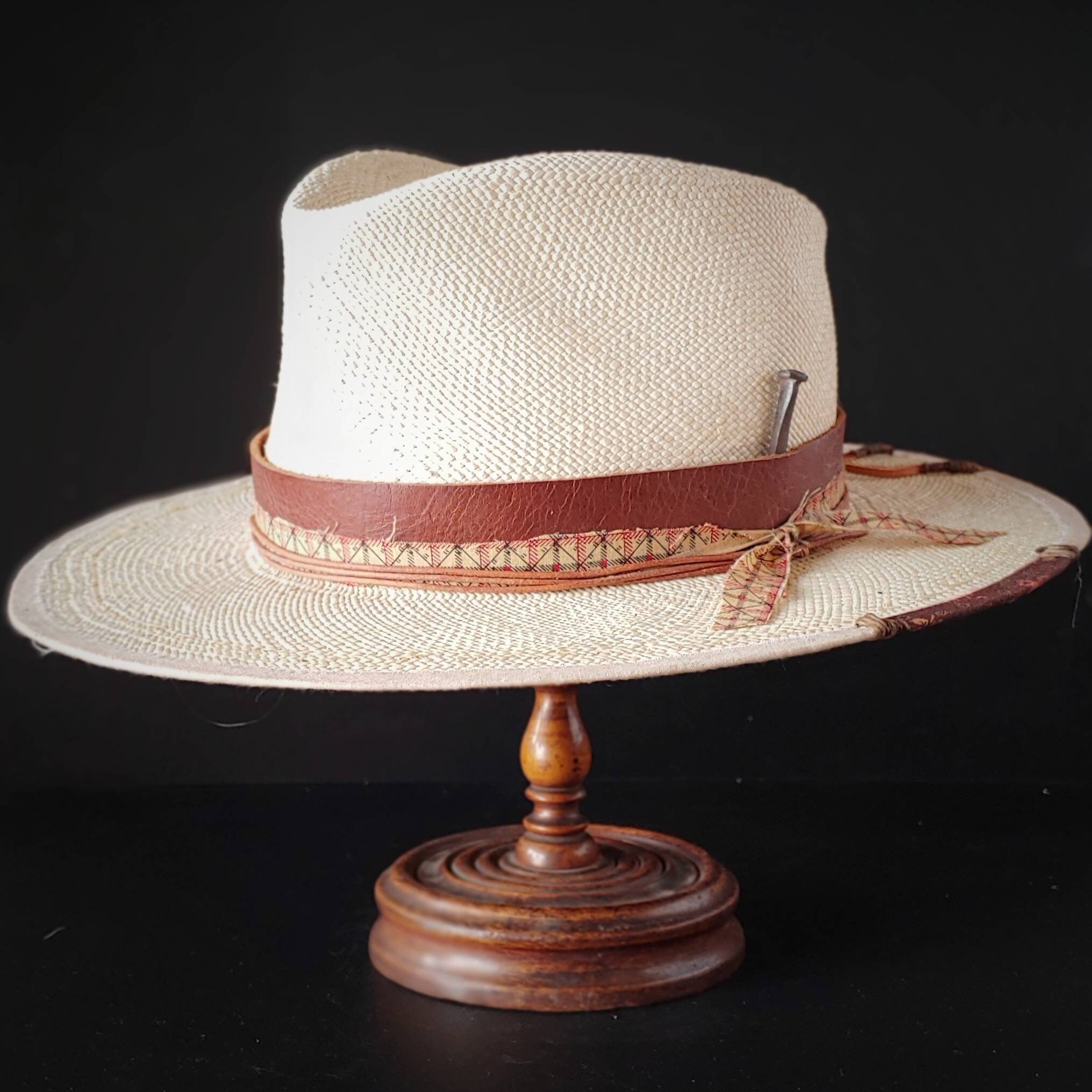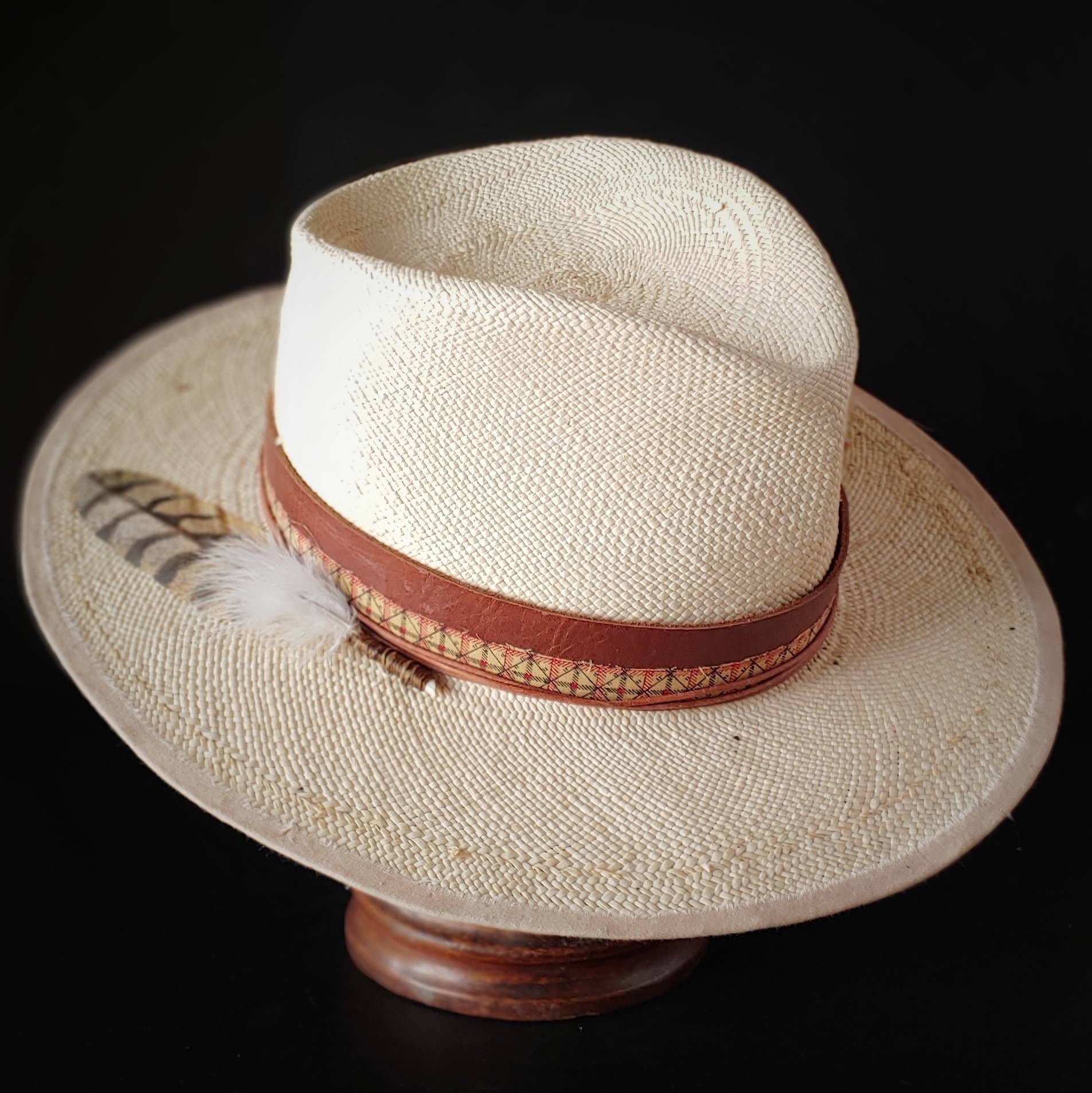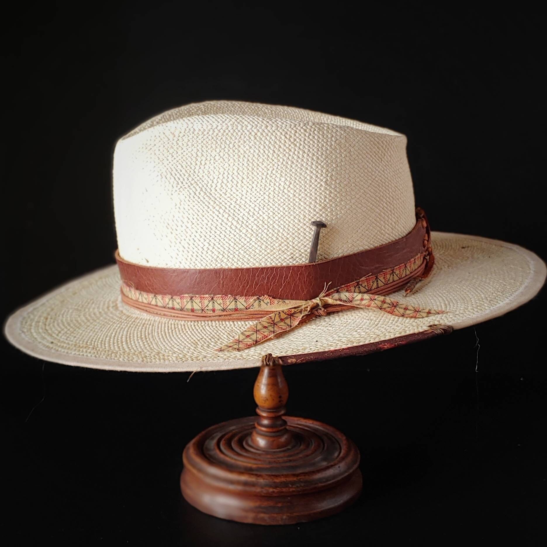Fedora style with a leather band that ties off in the back. A replica 1800s pattern fabric wraps around and ties off on the side. Light tan leather cord also compliments the layers which ties off on the side. A replica owl feather rest on the back right side of the brim. Antique rose head nail is stuffed into the leather band. Cream linen trim wraps around the brim with stitching and a small piece of pattern fabric.