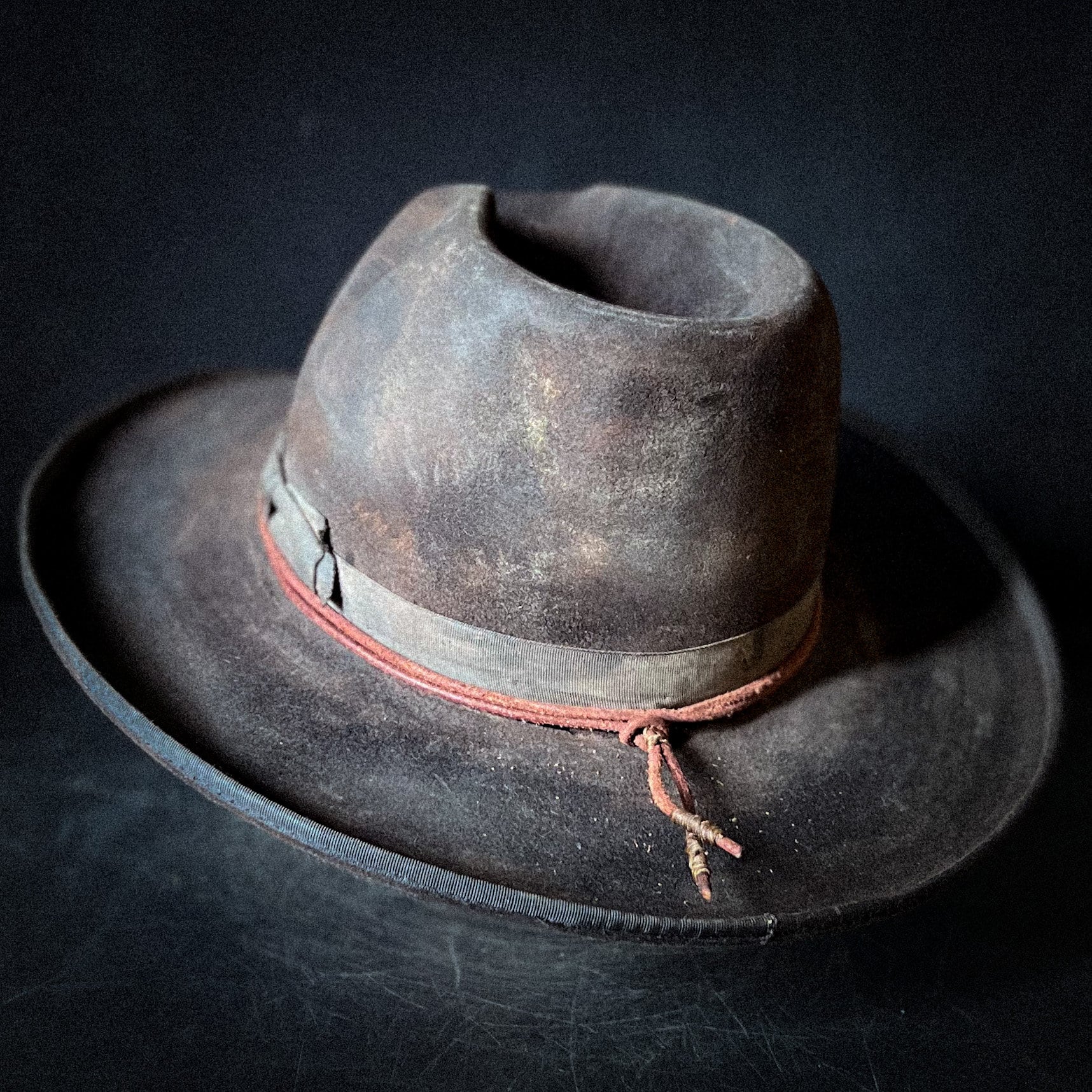 The “Maverick of Mayhem” is a vintage beaver fur hat that has been gutted, re-shaped and molded to fit the Ugly Outlaw aesthetic. Distressed to look worn and shaped to look mean! Size 7 (56cm). Simple Western design with distressed grossgrain black ribbon and leather cord that wraps around and ties off in the back.