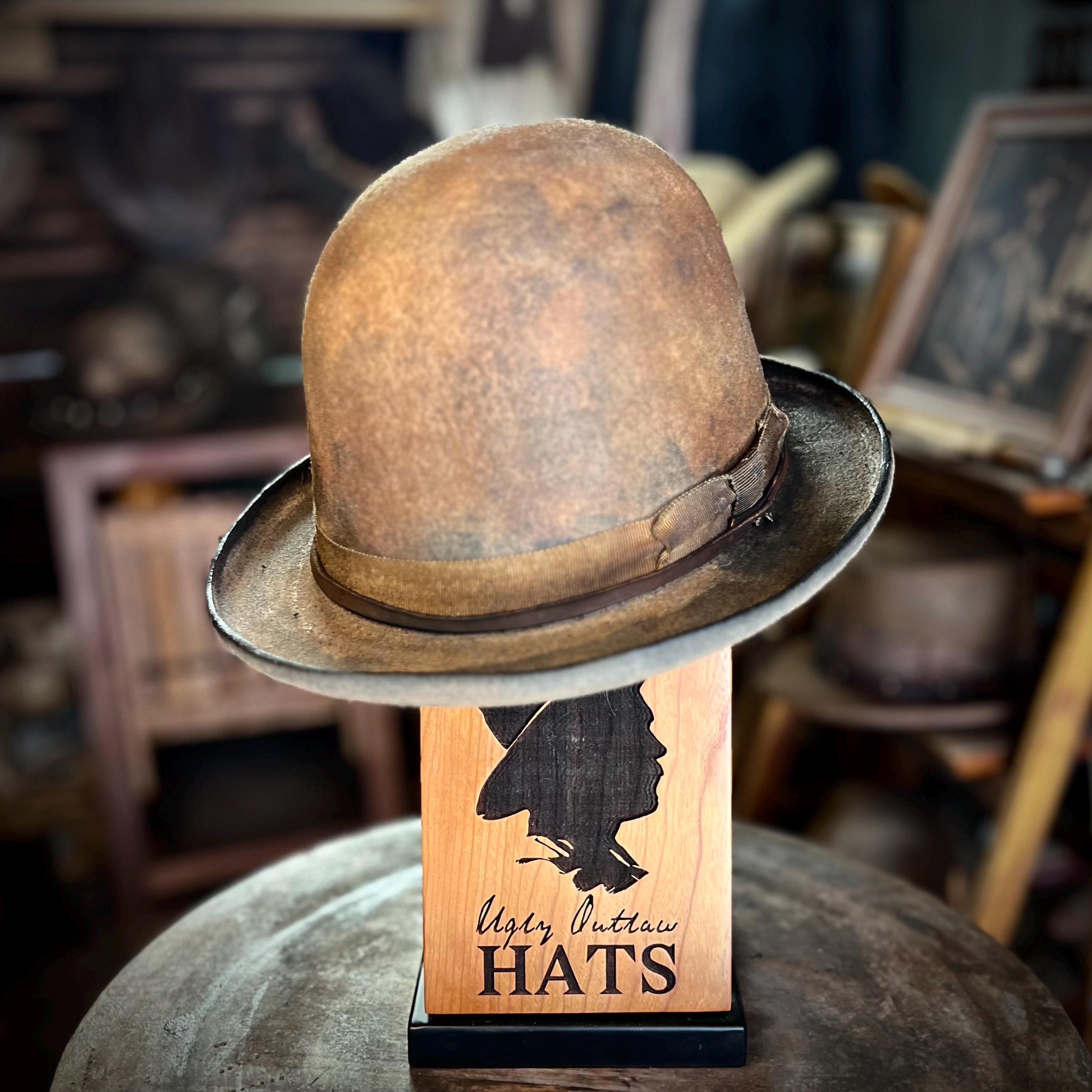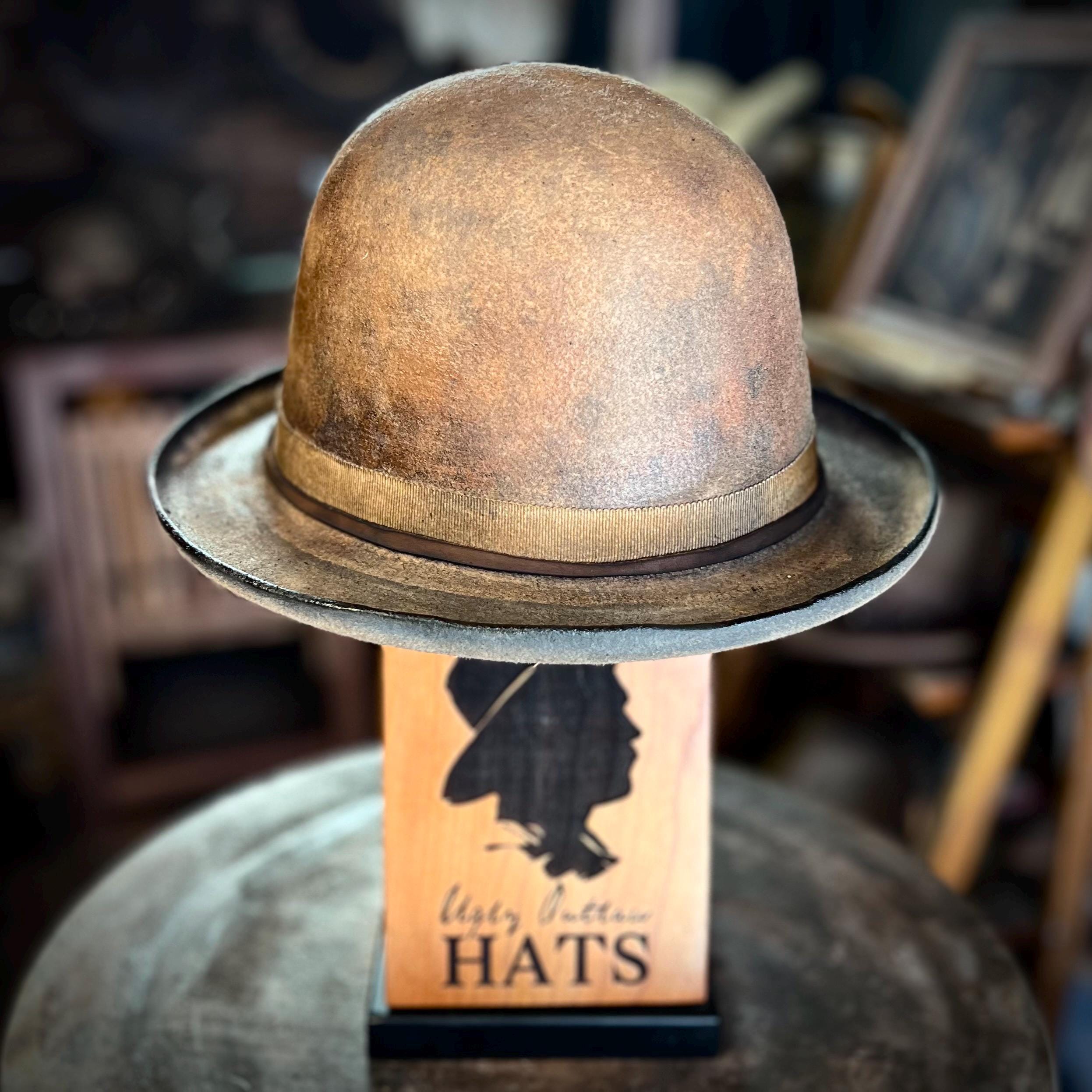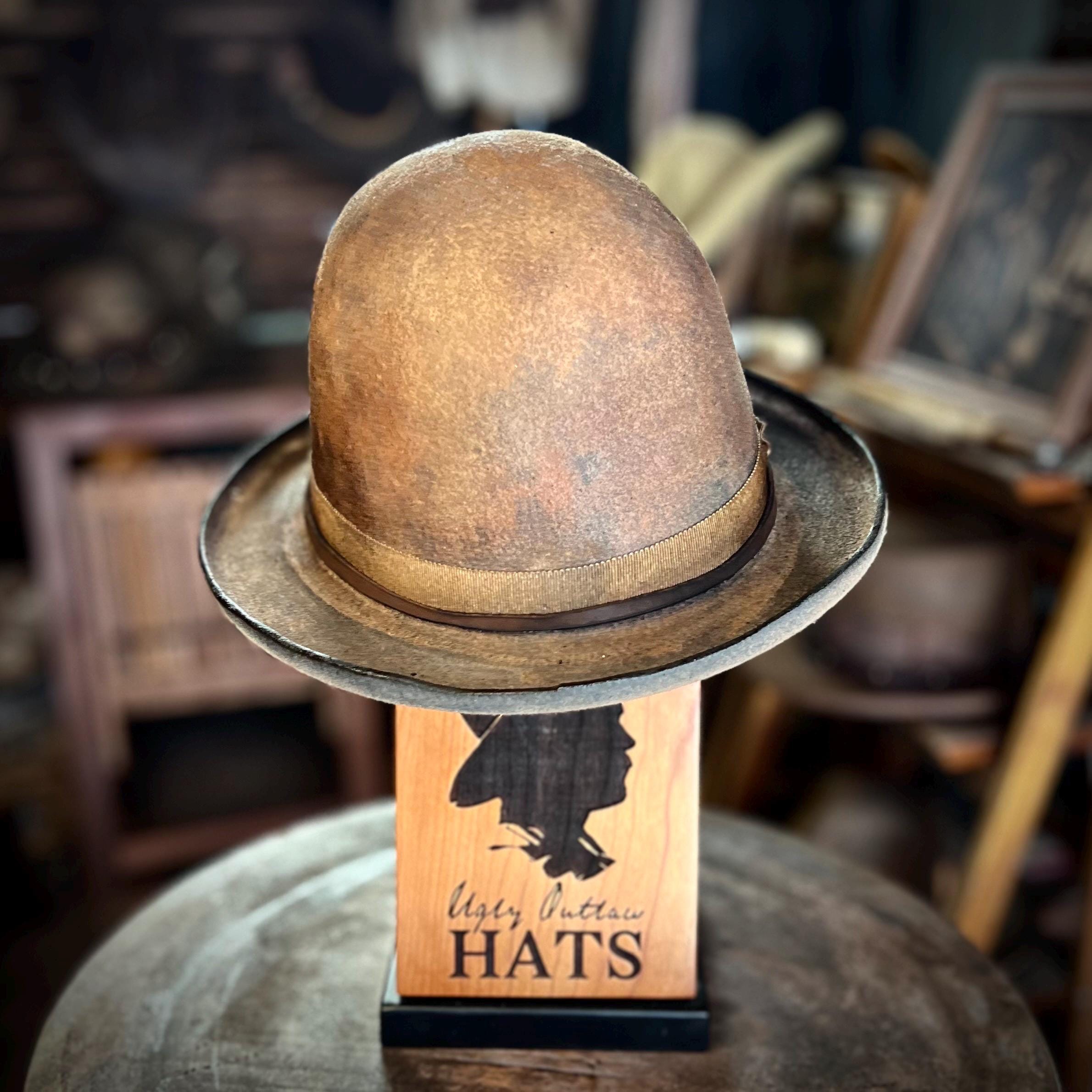 The “Sinister Sidekick” is a size 7 1/8 long oval (57cm) made of 100% wool. Thick wool at 220g. Western bowler type, distressed to look worn with a calf leather sweatband on the inside and a satin liner.
