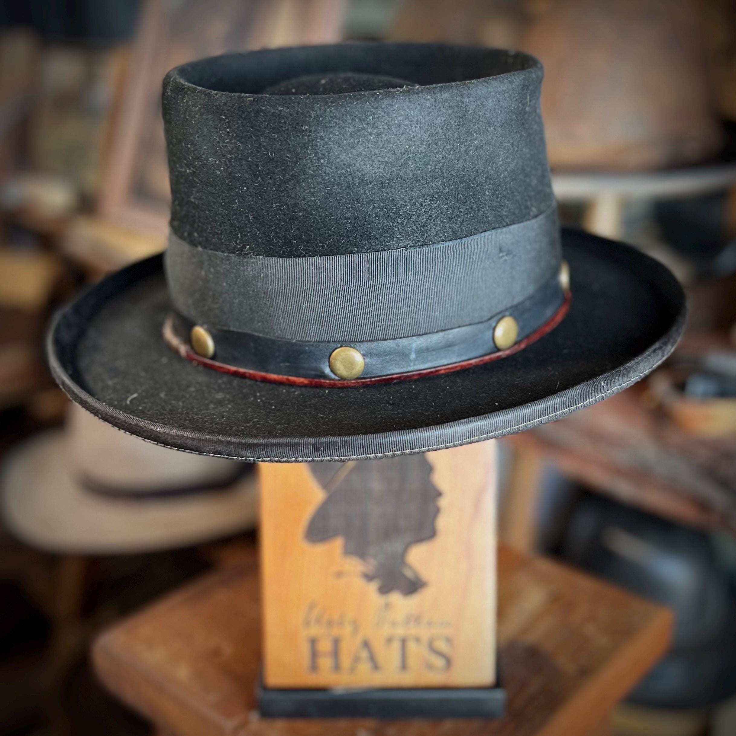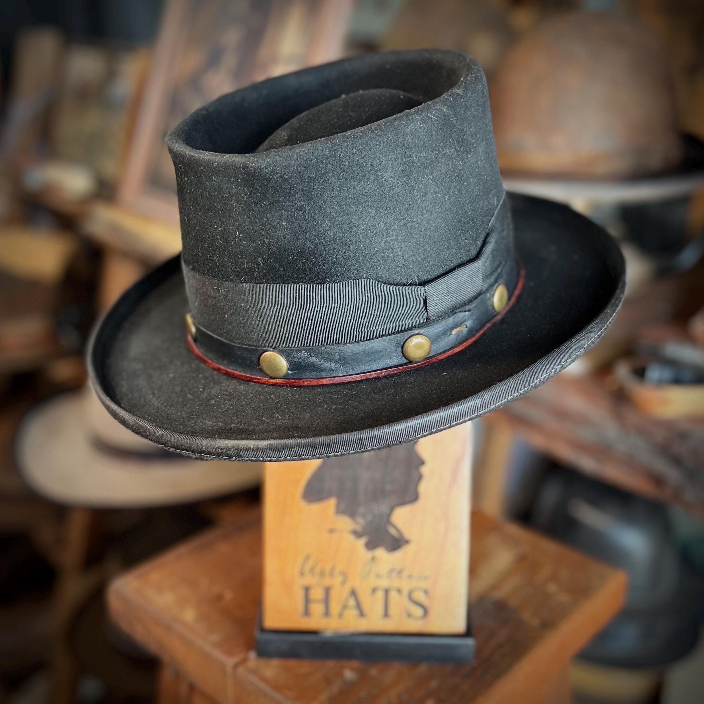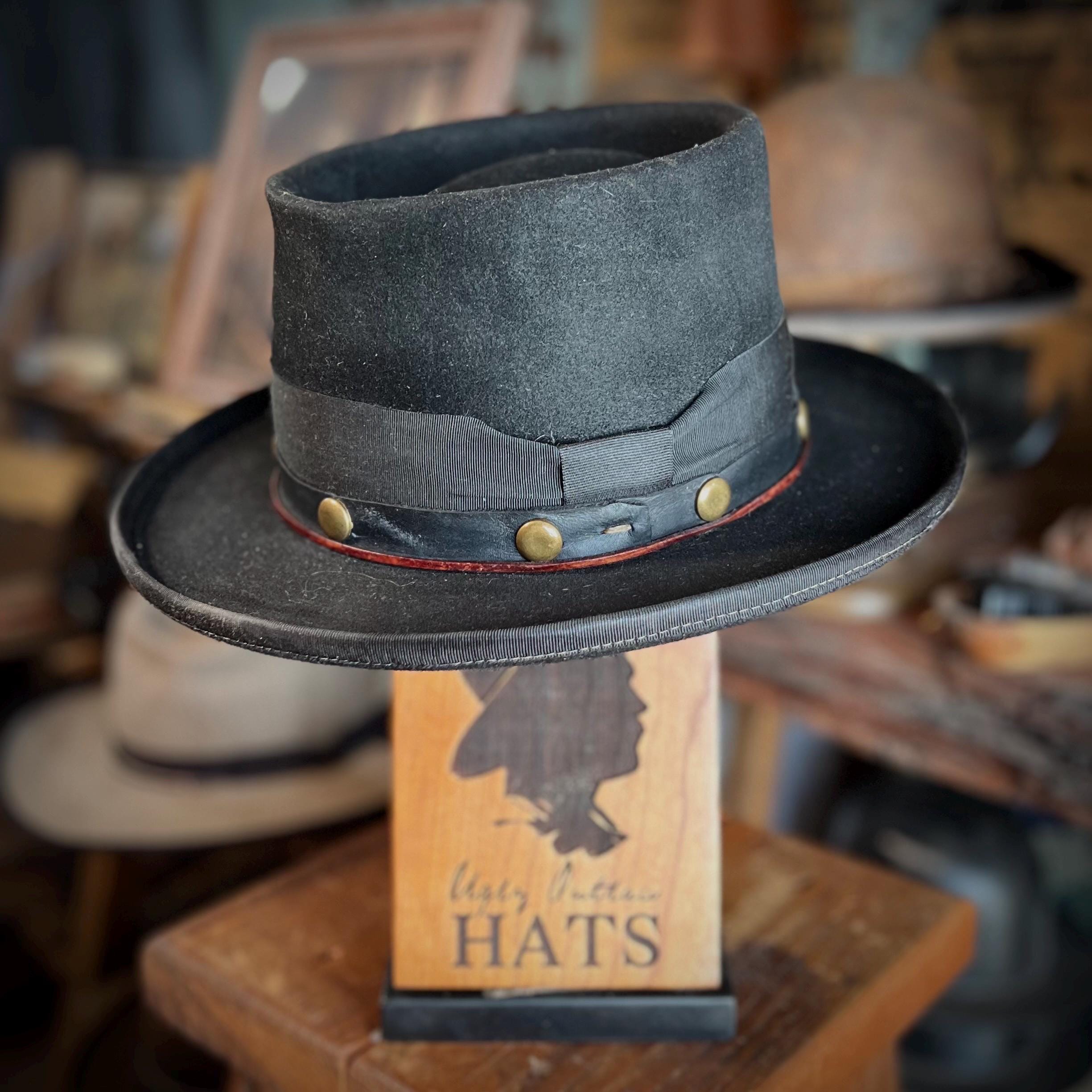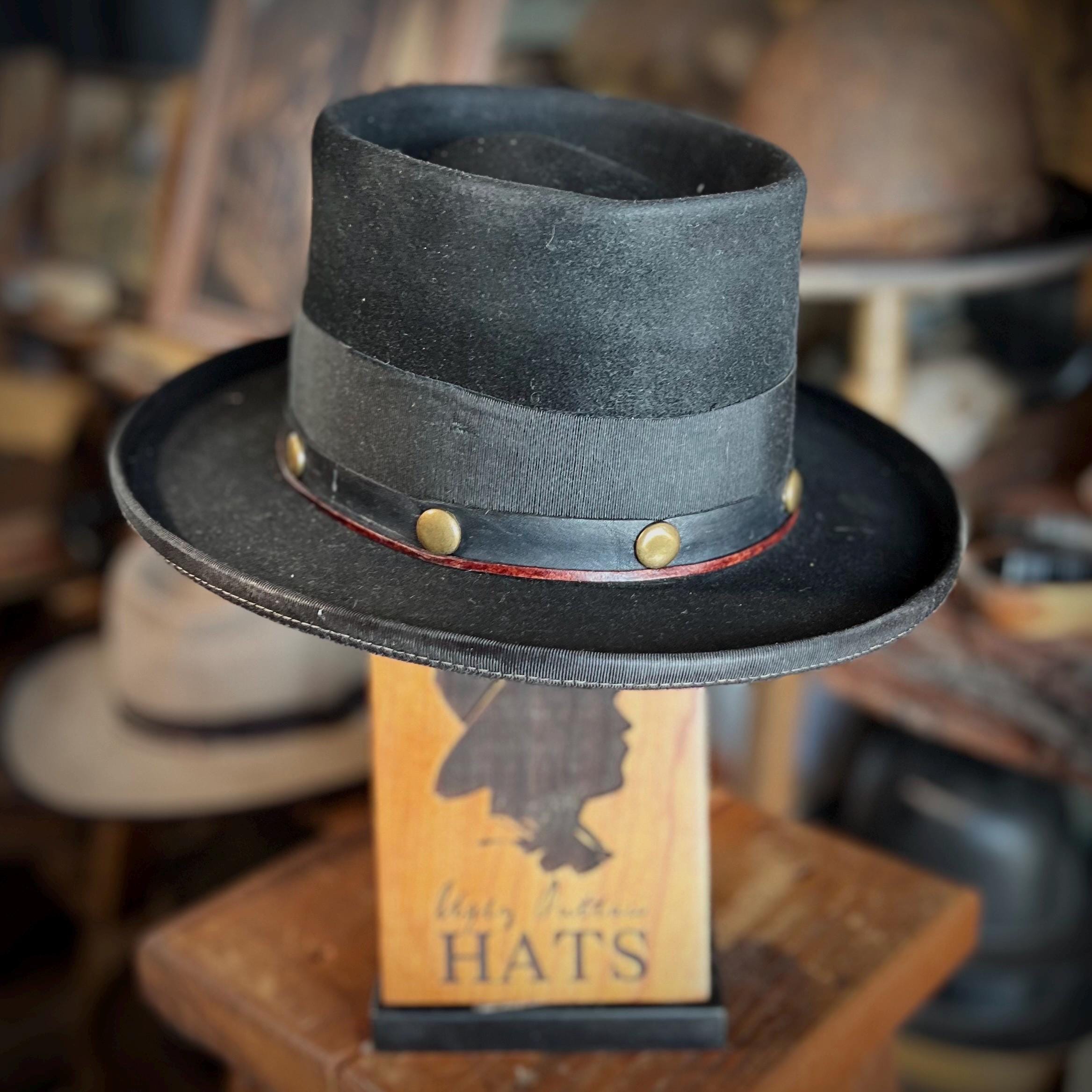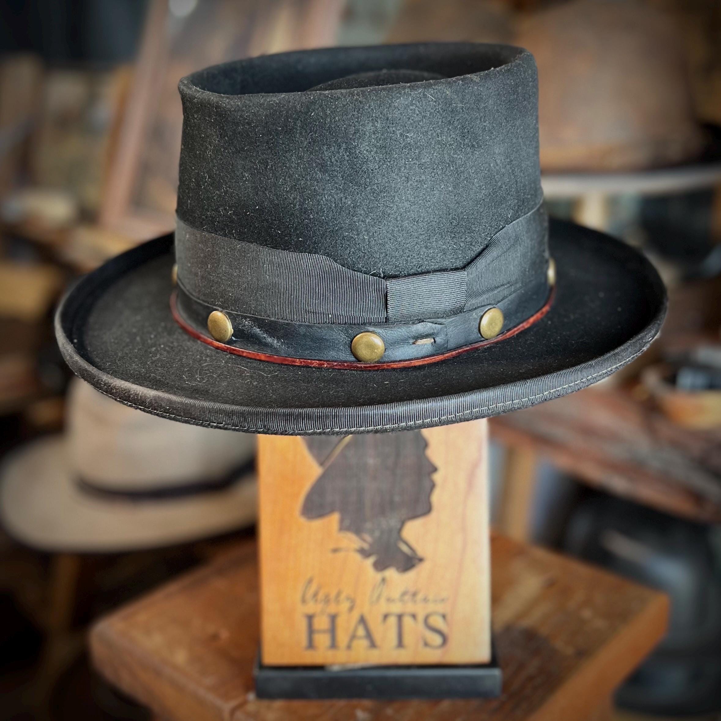 The “Unassuming” is a size 7 1/8 (57cm) hat. Black, made of a combination beaver / hare blend at 200g Western weight. Durable, handmade by Ugly Outlaw. A simplistic design similar to a Billy the Kid type design. The inside has a comfortable calf leather sweatband and a satin liner. Handmade, one of a kind from Ugly Outlaw Hats.