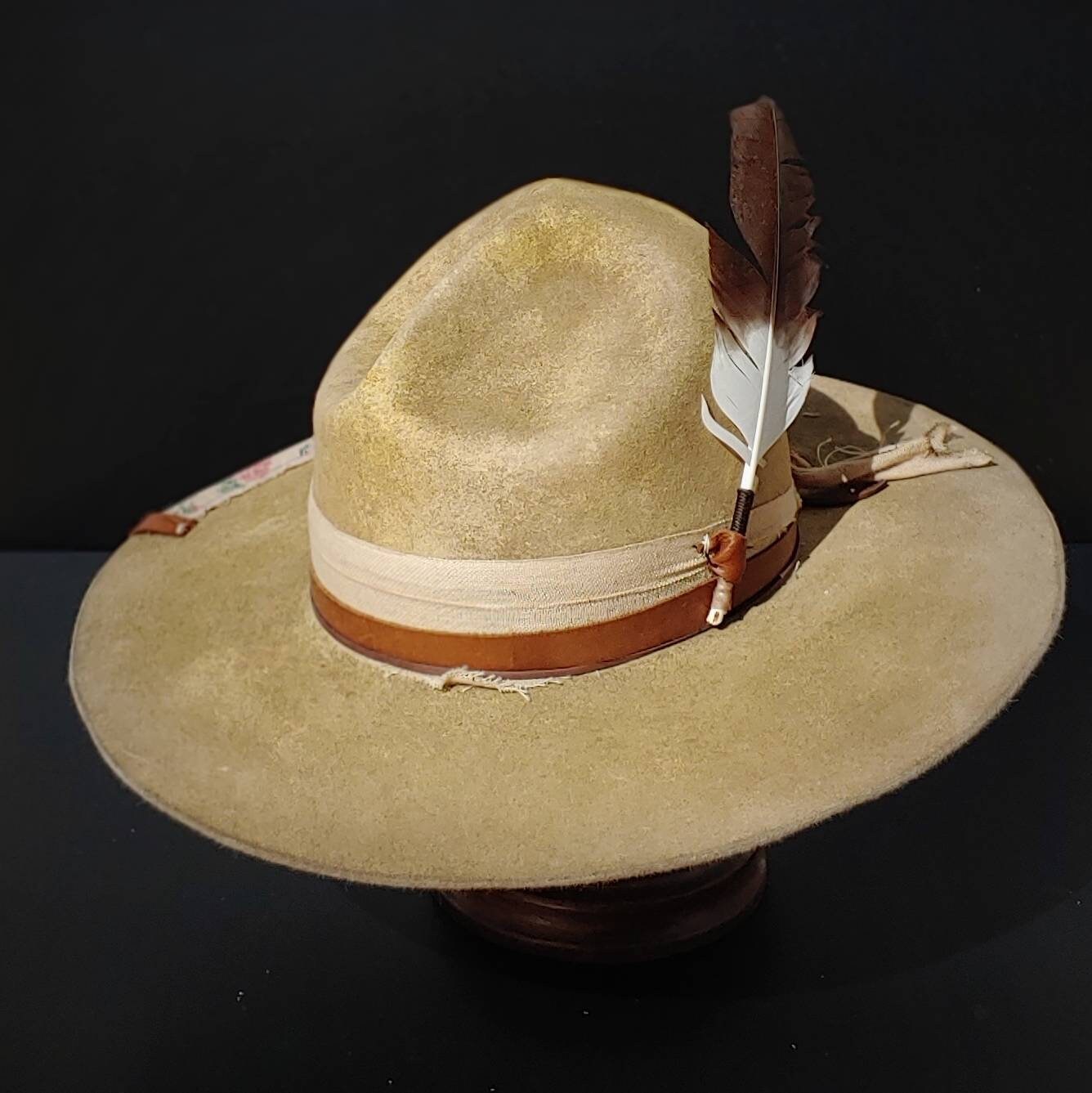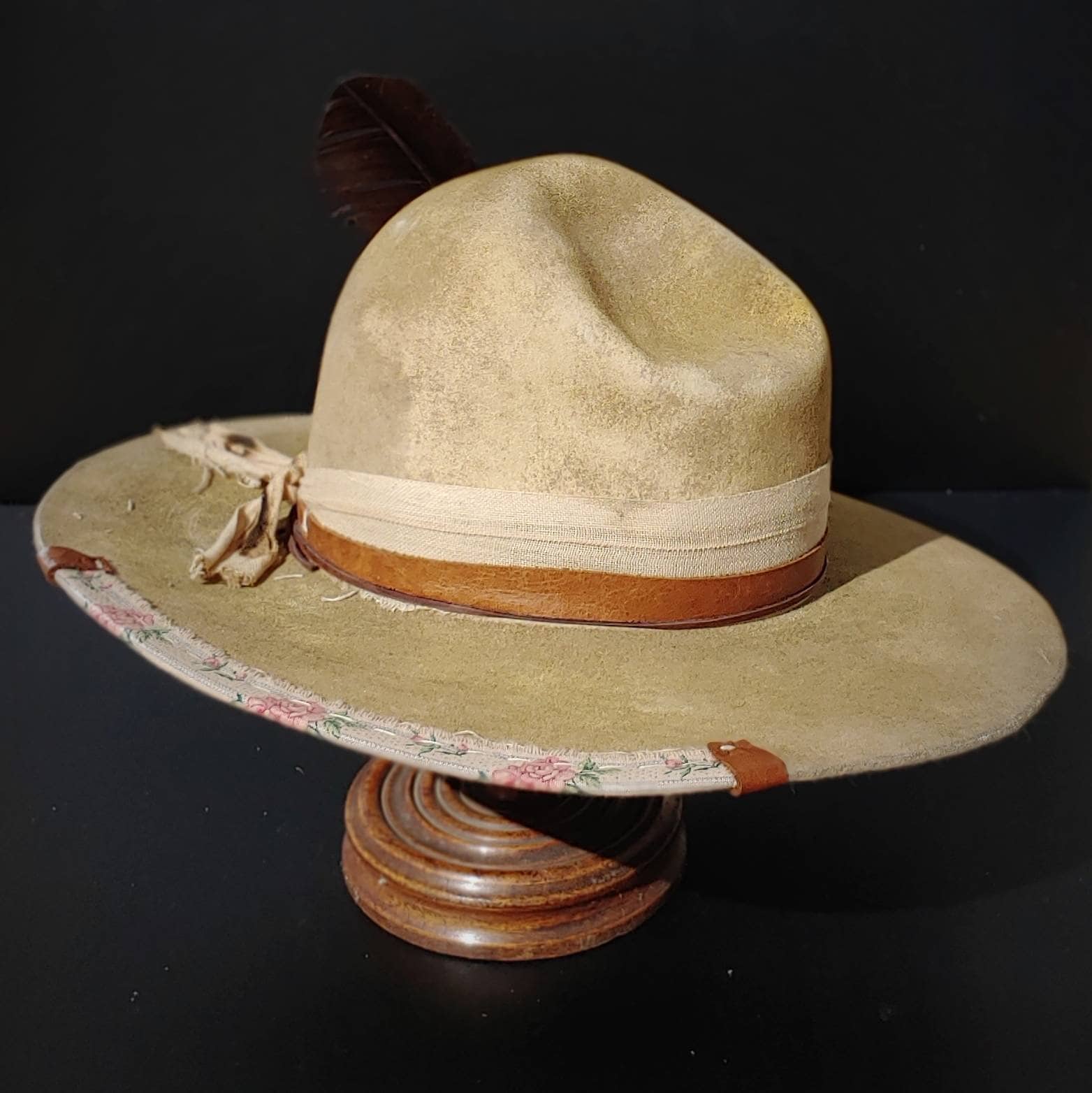 Dirty tan, distressed by Ugly Outlaw. Size 6 7/8, 3 1/2 inches wide brim with approx. 5 1/2 inches high crown. Two divot pinch crease in top. 100% hare and durable weight. Crown is wrapped in a tattered beige/cream linen wild rag that ties off in the back. Tan leather band wraps around and ties off in the back with leather lace and is hand-stitched for extra enforcement. Tan leather feather holder holds feather on the left side. Right side of the brim has tea stained vintage rose floral ribbon stitched into it. Tan leather covers both ends of floral ribbon.