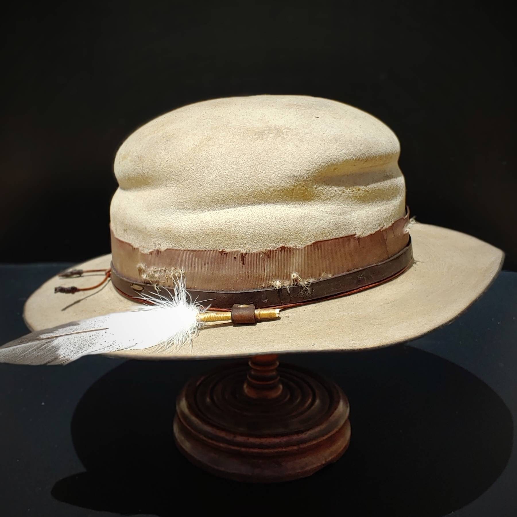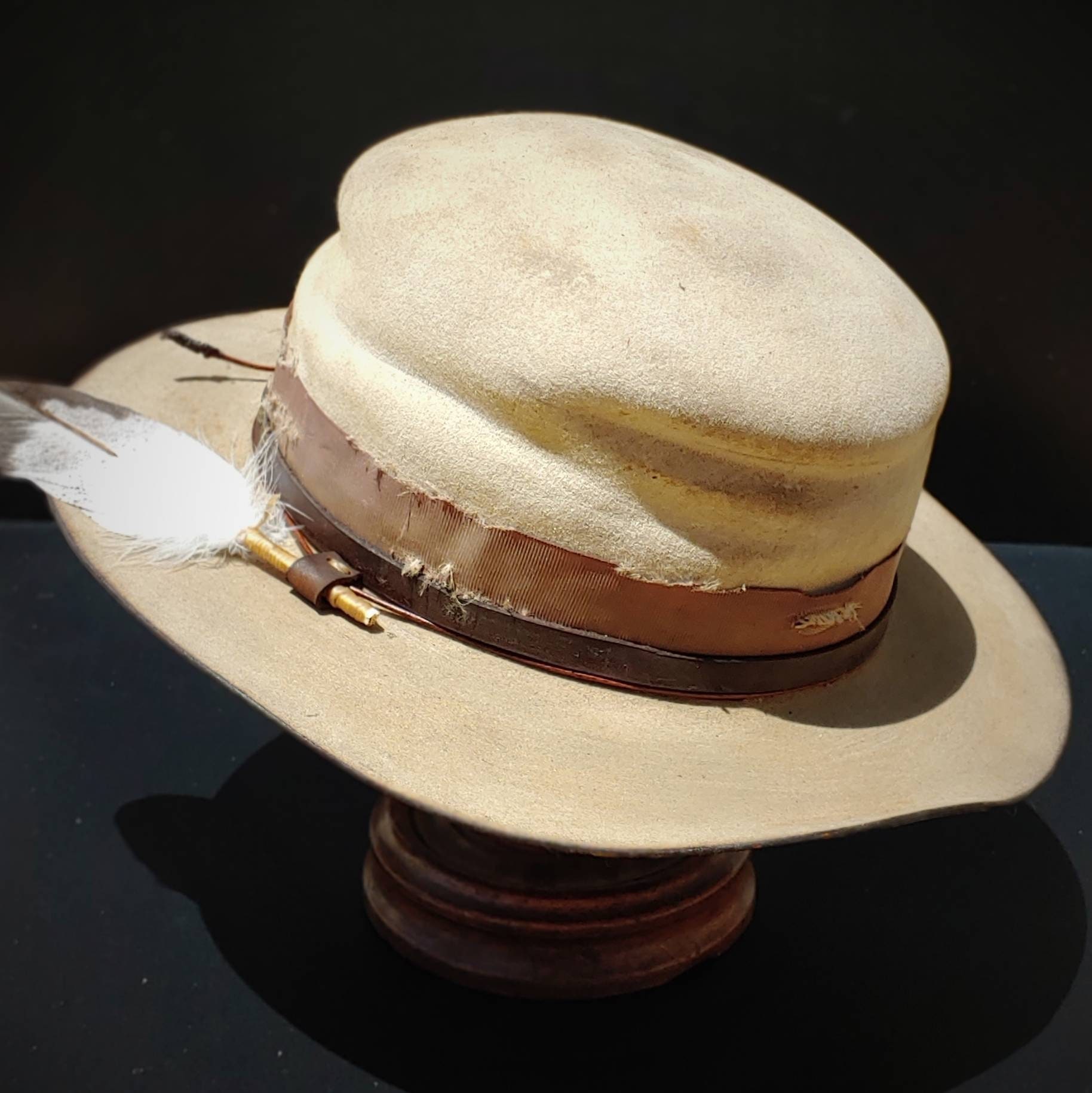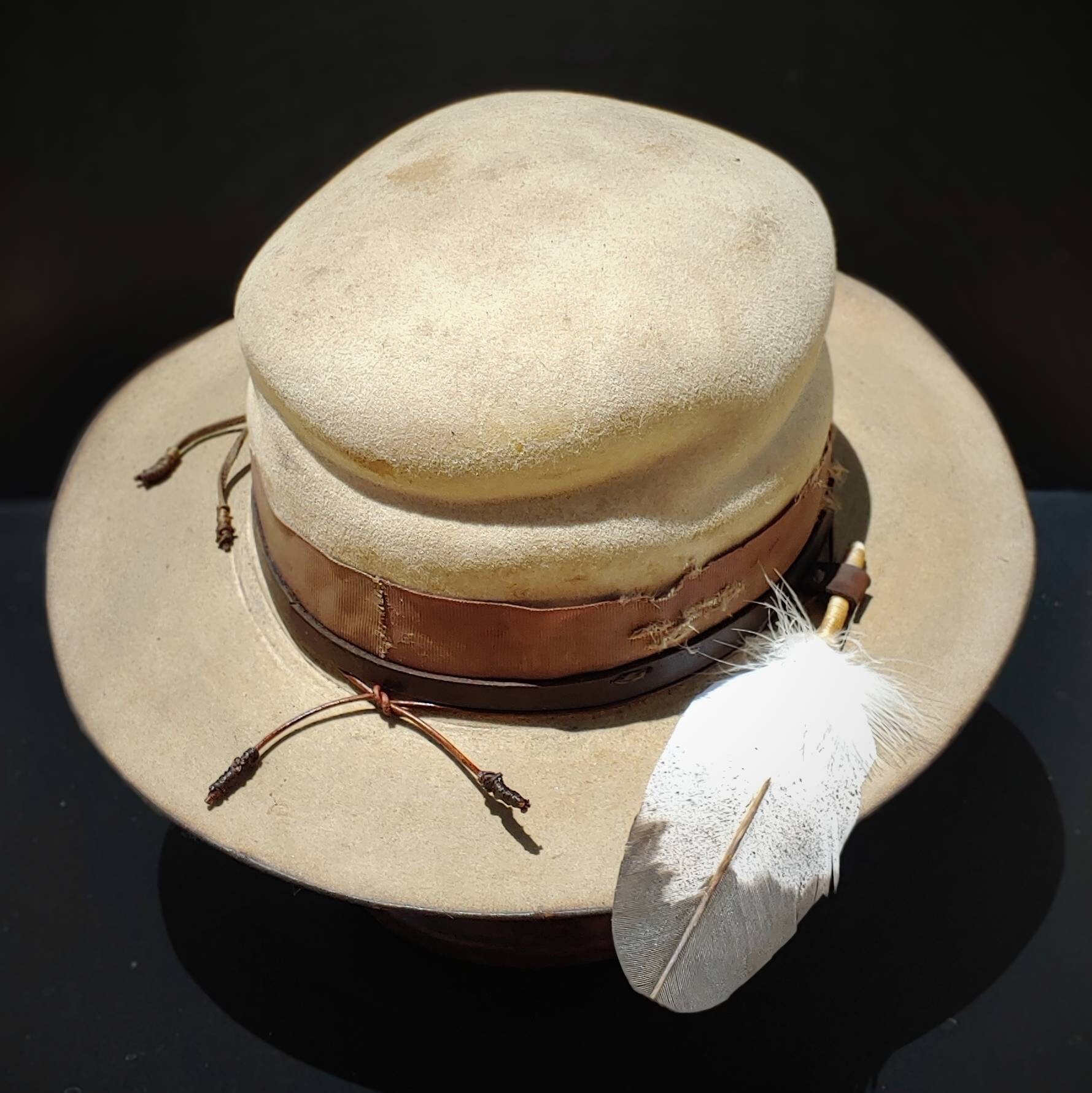 The "Outlaw's Sidekick" is a distressed bone color, made to look aged and worn, size 7 3/8. 4 inches high crown with a 2.75 inches brim with natural waves and curl. 100% quality rabbit fur. Distressed tan gross grain ribbon wraps around the crown followed by a homemade leather band that ties off on the side. A homemade replica Eagle feather lays on the brim, attached by a leather loop and lace. The inside has a genuine cowhide leather sweatband and a red satin liner with the Ugly Outlaw logo on it. The "Outlaw's Sidekick" is a one-of-a-kind, hand-made hat from the Ugly Outlaw collection.