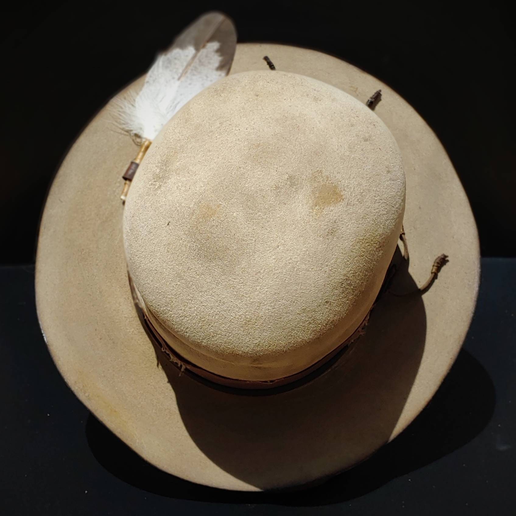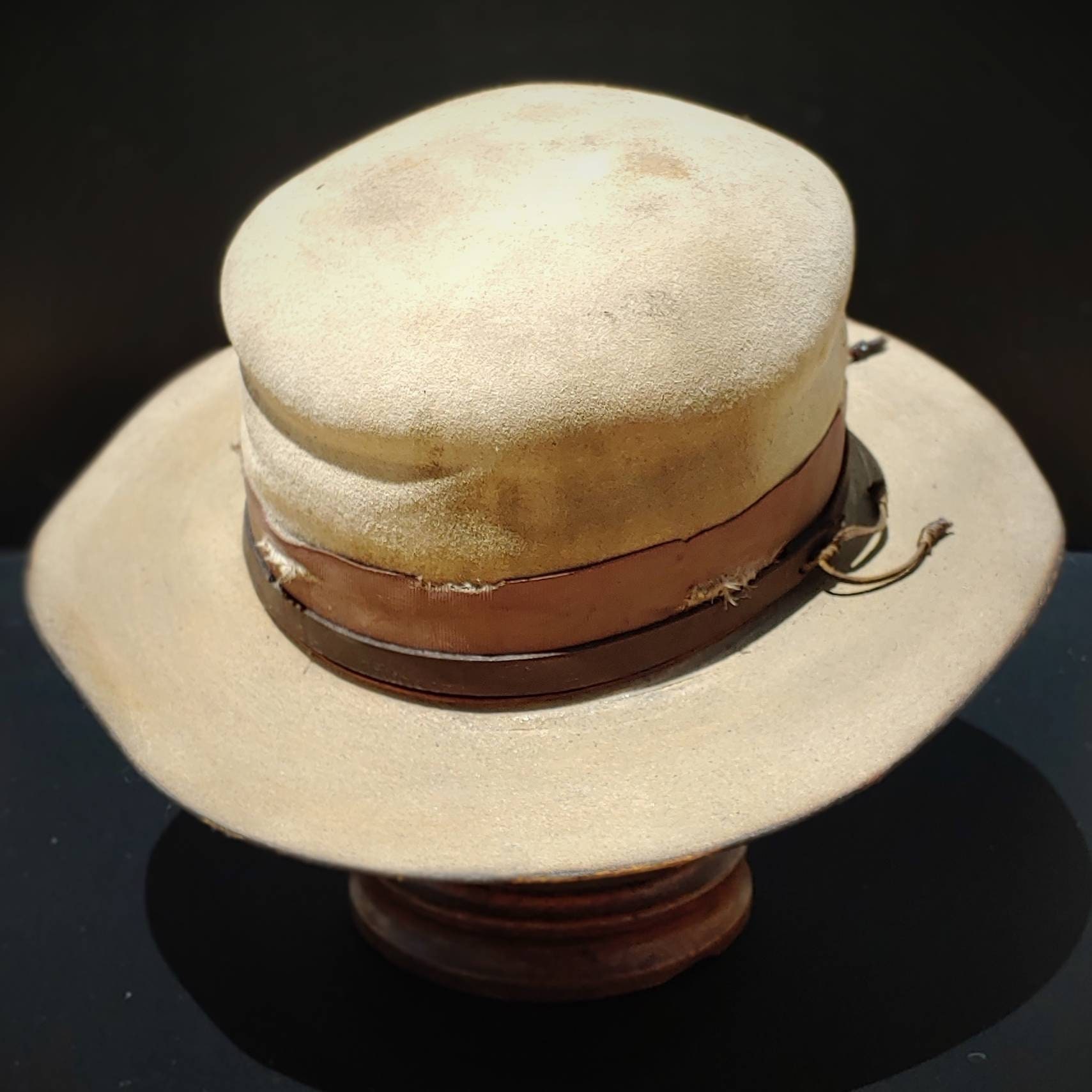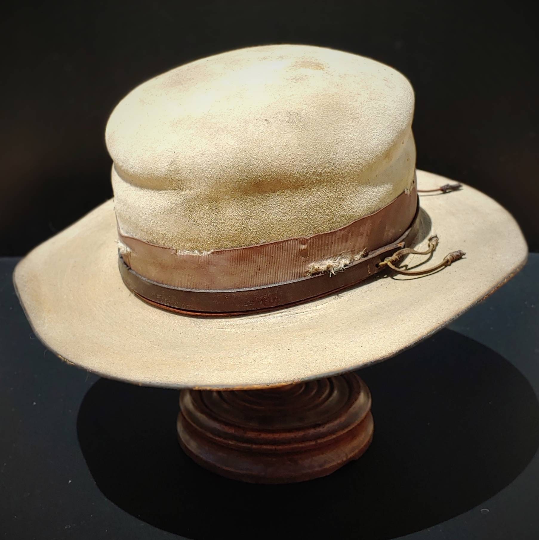The "Outlaw's Sidekick" is a distressed bone color, made to look aged and worn, size 7 3/8. 4 inches high crown with a 2.75 inches brim with natural waves and curl. 100% quality rabbit fur. Distressed tan gross grain ribbon wraps around the crown followed by a homemade leather band that ties off on the side. A homemade replica Eagle feather lays on the brim, attached by a leather loop and lace. The inside has a genuine cowhide leather sweatband and a red satin liner with the Ugly Outlaw logo on it. The "Outlaw's Sidekick" is a one-of-a-kind, hand-made hat from the Ugly Outlaw collection.