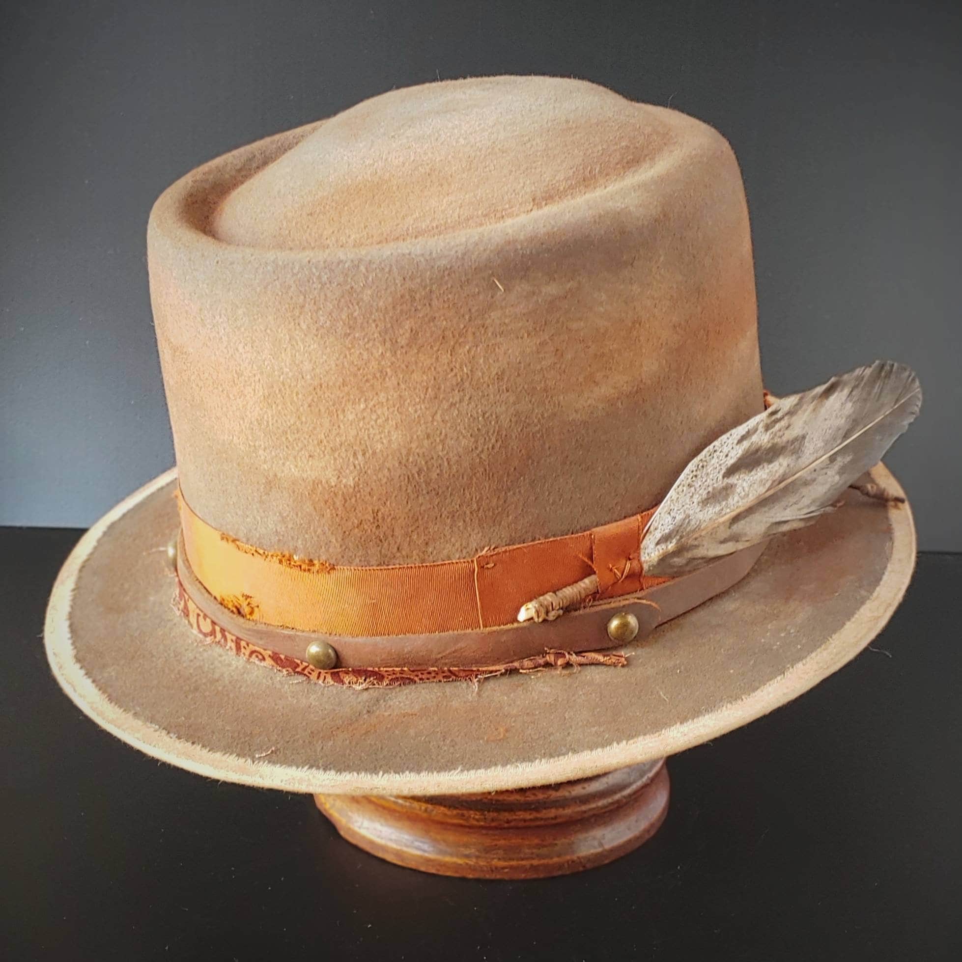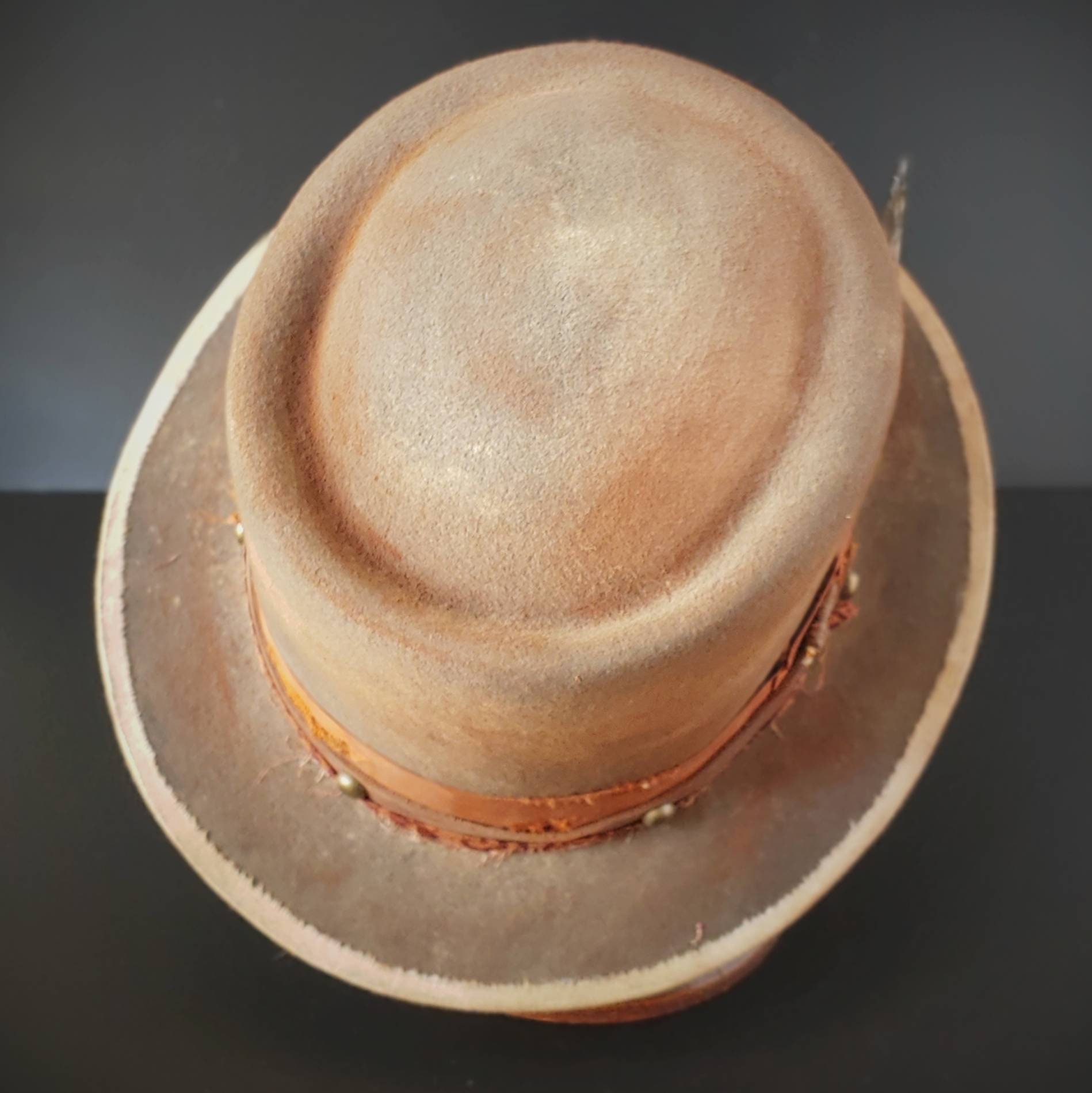 The "Copper Town Hoodlum" from Ugly Outlaw is a distressed gray, size 7 3/8 (59cm). 100% quality European Hare. Approximately 5 inches high crown and a 2 inch wide brim.